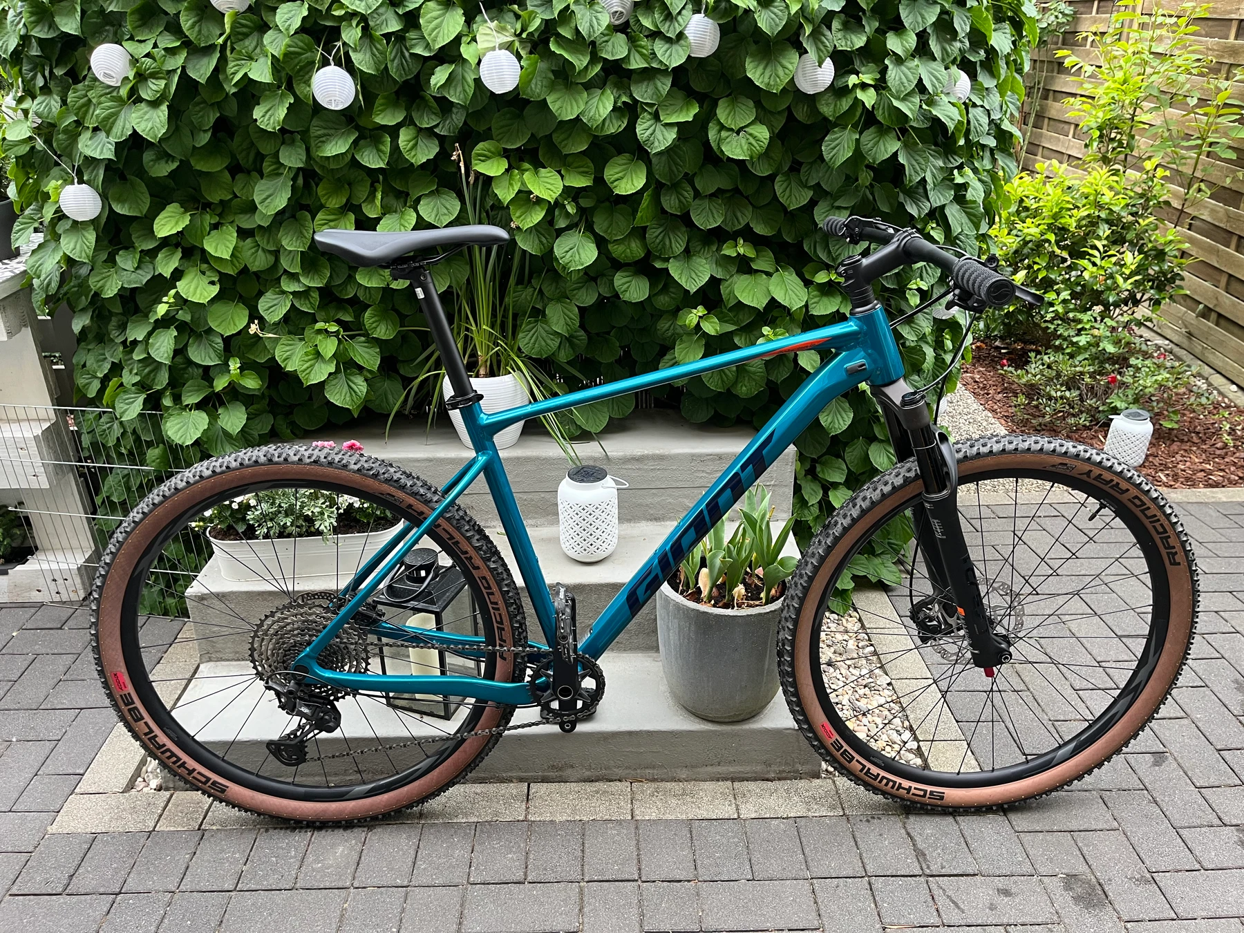 Verkaufe hier schweren Herzens mein Giant XTC SLR1 in der Größe XL und mit 29 Zoll Bereifung. Das Rad ist in einem guten Zustand und ist ein treuer, spaßiger Gefährte! Giant hat hier echt gute Arbeit geleistet. Fakten zum Rad: -Typ: Hardtail Mountainbike -Rahmengröße: XL (1,85m-2,00m Körpergröße) -Laufleistung: 1.000 km -Schaltwerk: Shimano Deore XT M8100, 1x12-fach -Gabel: GIANT Crest 34 RRL, 100 mm Federweg, am Lenker verriegelbar -Bremsen: Shimano BR-MT500 -Reifen: Tubeless Racing Ray, Racing Ralph Addix Speed 29x2,5 -Pedale: Raceface Chester -Kaufdatum: 13.03.2021 (Rechnung liegt vor) -Damaliger Kaufpreis: 1.499€ Die Reifen sind vor 4 Wochen neu aufgezogen worden, die Dichtmilch wurde natürlich auch gewechselt. Ebenso die Ventile. Die Bremsen sind kürzlich entlüftet worden und die Beläge wurden bisher auch einmal getauscht. Das Rad hat zwei wesentliche Lackkratzer (siehe Bilder). Einmal durch Stoß beim Anlehnen und einmal durch Minischutzbleche, die etwas am Lack gerieben haben. Grund für den Verkauf ist der Umstieg aufs Rennrad.