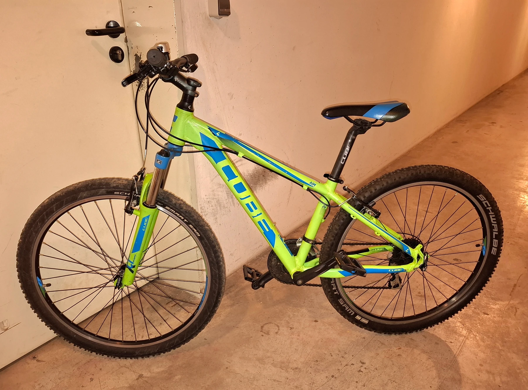 Hallo, ich verkaufe hier ein angesagtes Mountainbike Modell Aim von Cube. - Farbe blue'n'lime - leichter Aluminiumrahmen - Rahmenhöhe 14" / 36 cm - Federgabel SR Suntour - 3 x 8 Gang Kettenschaltung Shimano - V-Bremsen vorn und hinten - Bereifung Schwalbe - incl. Klingel Das Fahrrad befindet sich in sehr gutem Zustand mit normalen Gebrauchsspuren. Es wurde vor Kurzem einer gründlichen Inspektion unterzogen. Dabei wurden die Laufräder zentriert, Schaltung und Bremsen eingestellt sowie die Bremsbeläge, die Griffe und die Klingel erneuert. Es ist somit fit für die nächste Runde. Abholung in 99817 Eisenach, kein Versand. Auf Anfrage Anlieferung im Umkreis bis ca. 20 km möglich.