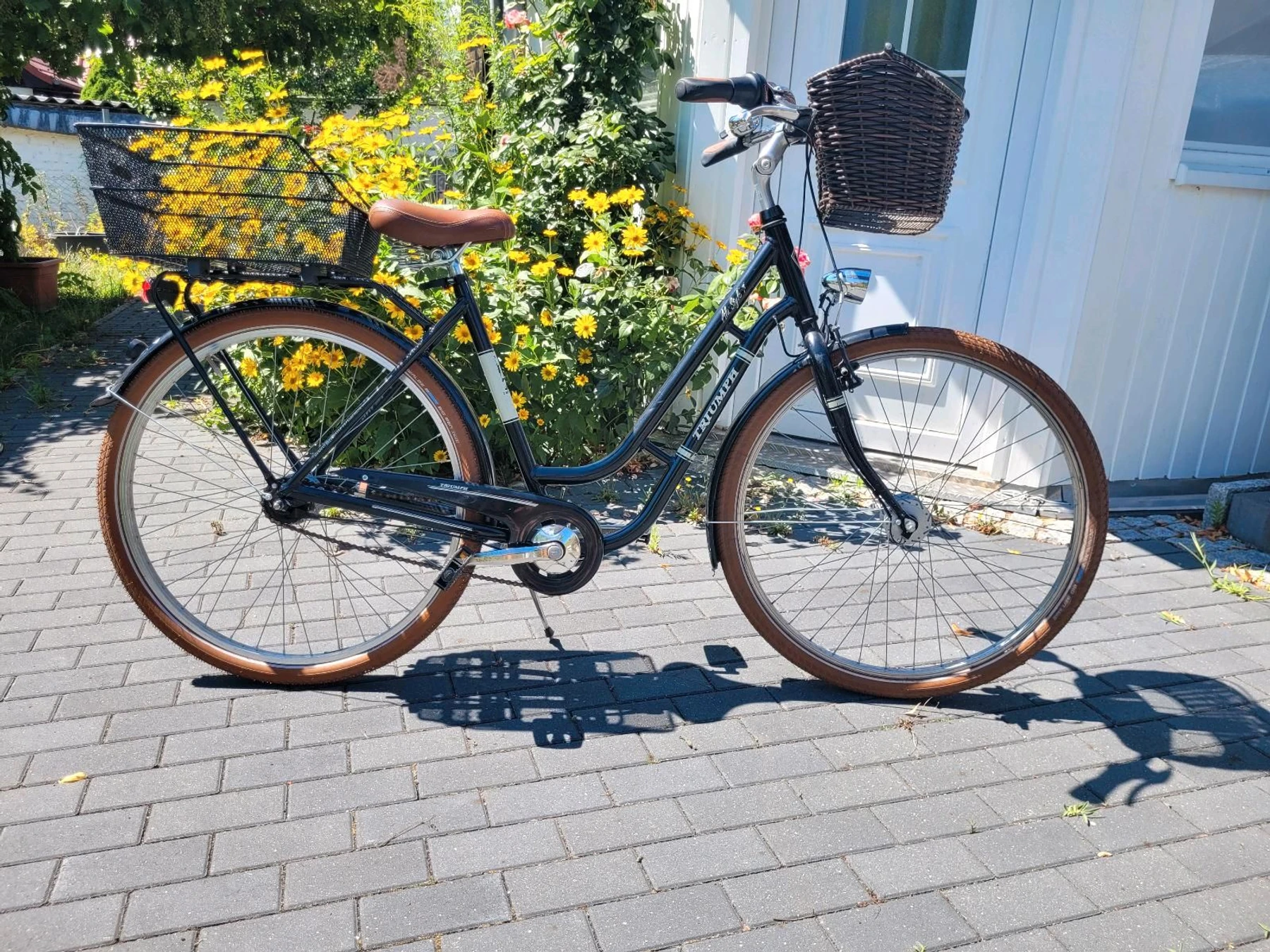 Bieten hier das Rad unserer Tochter an. Es wurde bei einer Körpergröße von ca. 1,65m gefahren und es ist noch Luft sowohl nach unten, als auch nach oben. Es ist nun 2 Jahre alt und wurde bei Stadler gekauft. Es handelt sich um das Modell Triumph Alu Style 7 Citybike mit einer 54er Rahmenhöhe. Es hat eine 7 Gang Nabenschaltung und auch Nabendynamo. Die Rechnung liegt momentan nicht vor, wird aber zum Wochenende hin bei Stadler besorgt. Aktueller Neupreis 550 EUR. Das Lenker Körbchen bleibt am Rad, der hintere Korb könnte mit erworben werden. Es wurden zum Frühling 2 neue Mäntel samt Schläuche aufgezogen. Technisch einwandfreier Zustand. Bremst sehr gut (neu eingestellt). Licht funktioniert ebenfalls. Es hat durch den täglichen Gebrauch (Fahrten zur Schule) ein paar leichte Gebrauchsspuren, ist ansonsten aber in einem guten Zustand. Kein Versand, Preis VB.