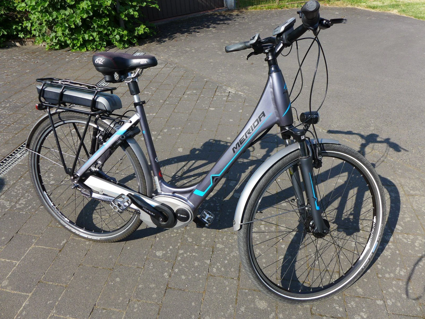 Ich verkaufe mein sehr gutes Damen e Bike, mit Tiefeinstieg von der Fa. Merida. Merida ist einer der größten Fahrradhersteller weltweit, sehr bekannt im Radrennsport. Das Fahrrad wurde 2015 gekauft und hat nur 3162 km gefahren. Der Sattel ist ein SQ lab Sattel mit einer Gebrauchsspur vorne, die Sattelstütze ist von AIRWINGS, einstellbar bis 120 kg Gewicht. Das Fahrrad hat Rücktritt! Mit Bosch Ladegerät und zusätzlich ABUS Kettenschloss.Schutzbleche aus Alu. Spezifikation: Motor: Bosch Active Line Akku: Bosch 400Wh Display: Intuvia Bremsen: Magura HS11 vorne und hinten. Zuladung: Max 120 kg Fahrradgewicht: 25,4 kg Farbe: matt - anthrazit Rahmengröße: 56 cm Gabel: SR Suntor 50 mm Schaltwerk: Shimano Nexus 8 Gang Nabe mit Rücktritt Kurbelganitur: FSA Metropolis Felge: Merida Cross V. 32L Reifen: Big Apple 50-622 Beleuchtung: Nabendynamo, Scheinwerfer und Rücklicht Trelock Gepäckträger: Bosch Das Fahrrad kann Probegefahren werden in OT von Nidda, kein Versand nur Abholung. Da Privatverkauf, keine Gewährleistung.