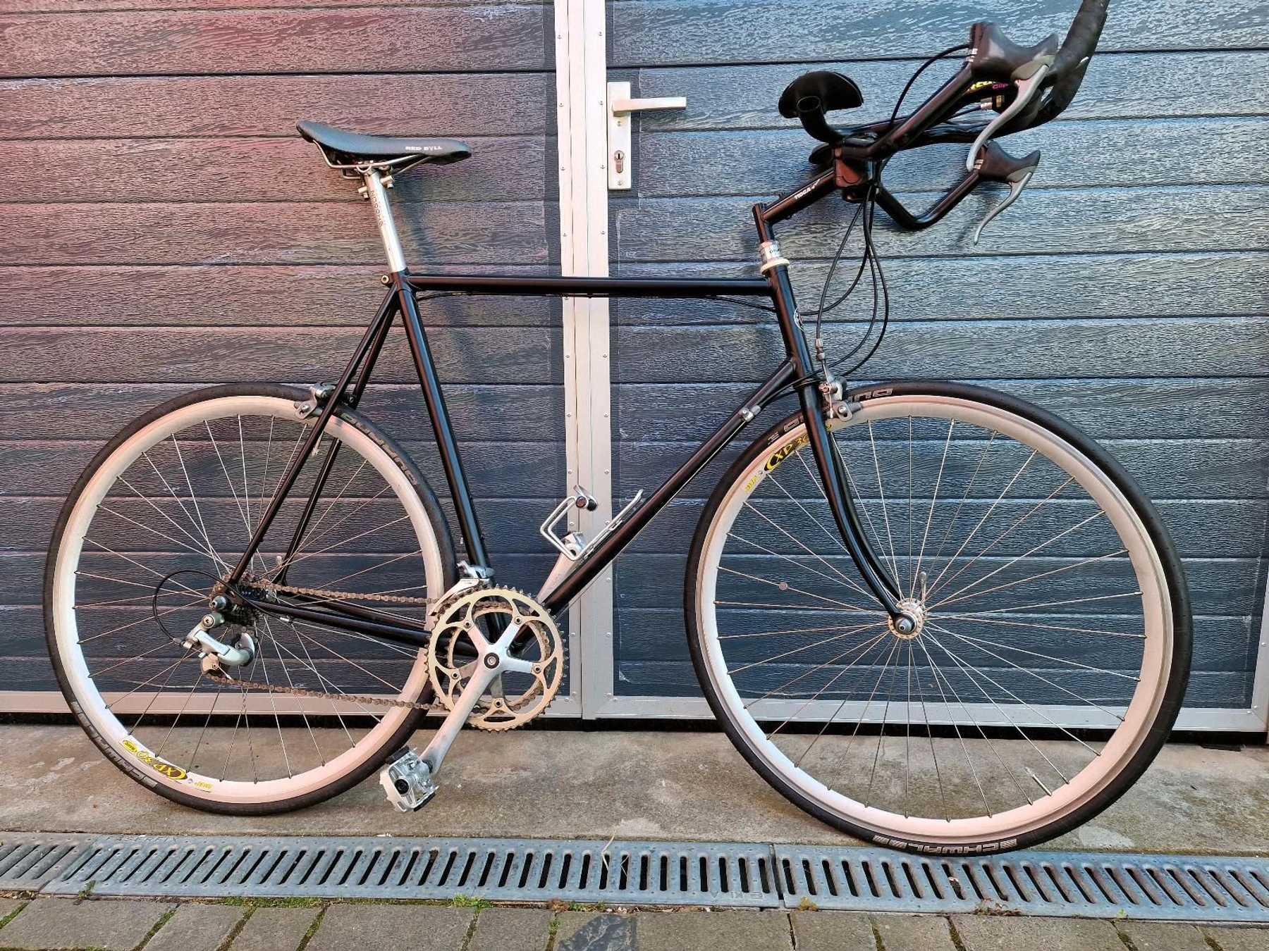 Ich verkaufe hier mein 90er Jahre Giant Rennrad mit 61er Stahlrahmen. Es wurde vor einigen Jahren komplett überholt inklusive einer Pulverbeschichtung des Rahmens. Danach wurde nur eine Probefahrt gemacht. Schalt- und Bremsgruppenteile sind, wie auf den Bildern zu sehen, Shimano 600 und 105 gemischt. Mit dem Triatlon-Lenker hat es ein Gewicht von 11,5 Kg. Die Felgen sind Mavic XP 30. Bei Fragen bitte einfach melden. Standort: Friedrichsdorf/Ts.