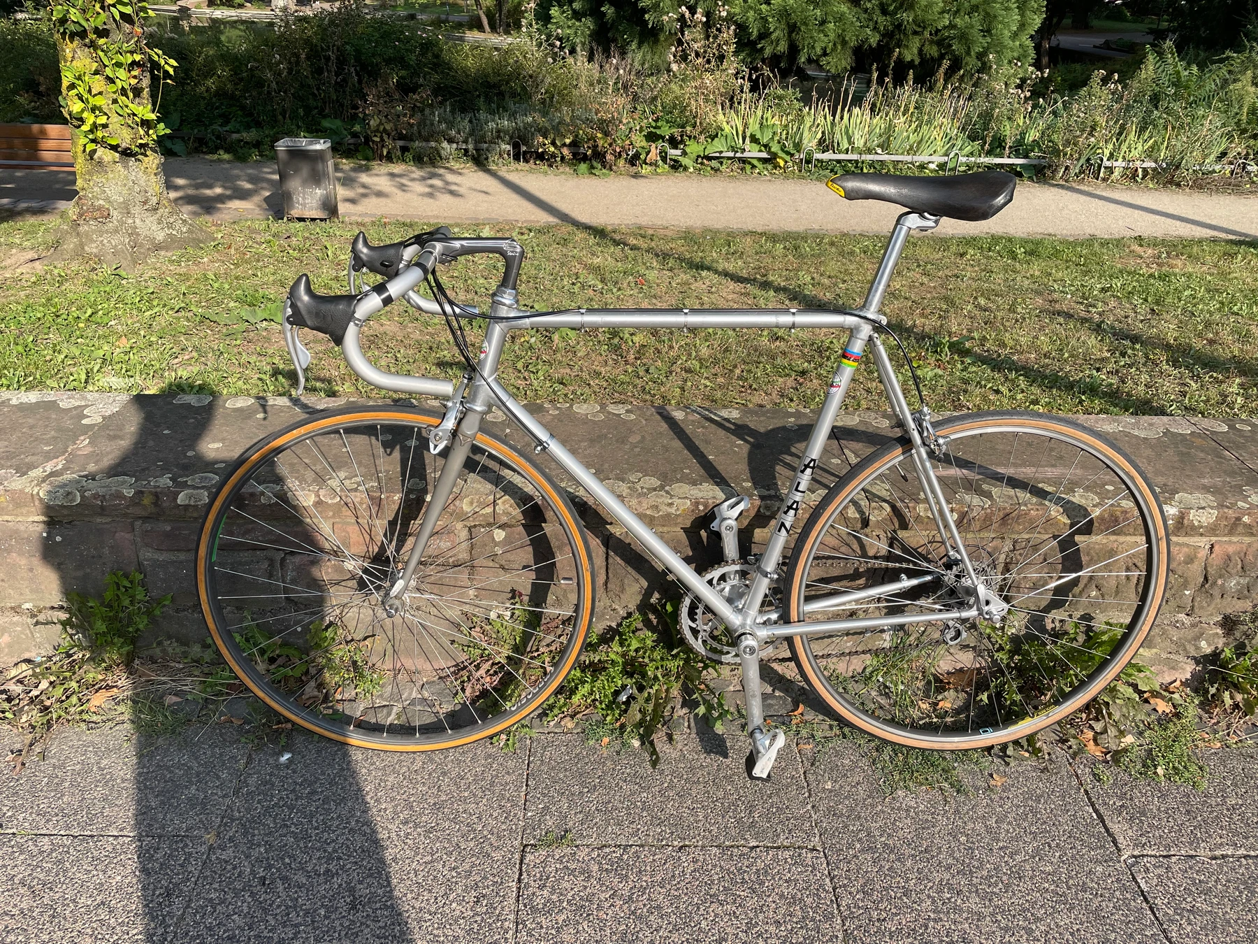 Eigentlich habe ich mir das Fahrrad nach meinen Traumvorstellungen zusammenbauen lassen, alle Teile sind von hohe Qualität und in perfektem Zustand. Ich verkaufe es nur, weil ich mir den Luxus gerade doch nicht leisten kann. Der Rahmen ist aus Alurohren, Die Teile von Campagnolo und aus der Shimano 600er Gruppe. Der Lenker ist neuwertig von Cinelli, die Brems-/Schalthebelkombi von Campagnolo. Vergleichbare Räder in ähnlichem Zustand werden für bis zu 1000 Euro verkauft. Am besten einfach selber ein Bild machen und Probefahren, das Rad fährt Traumhaft.